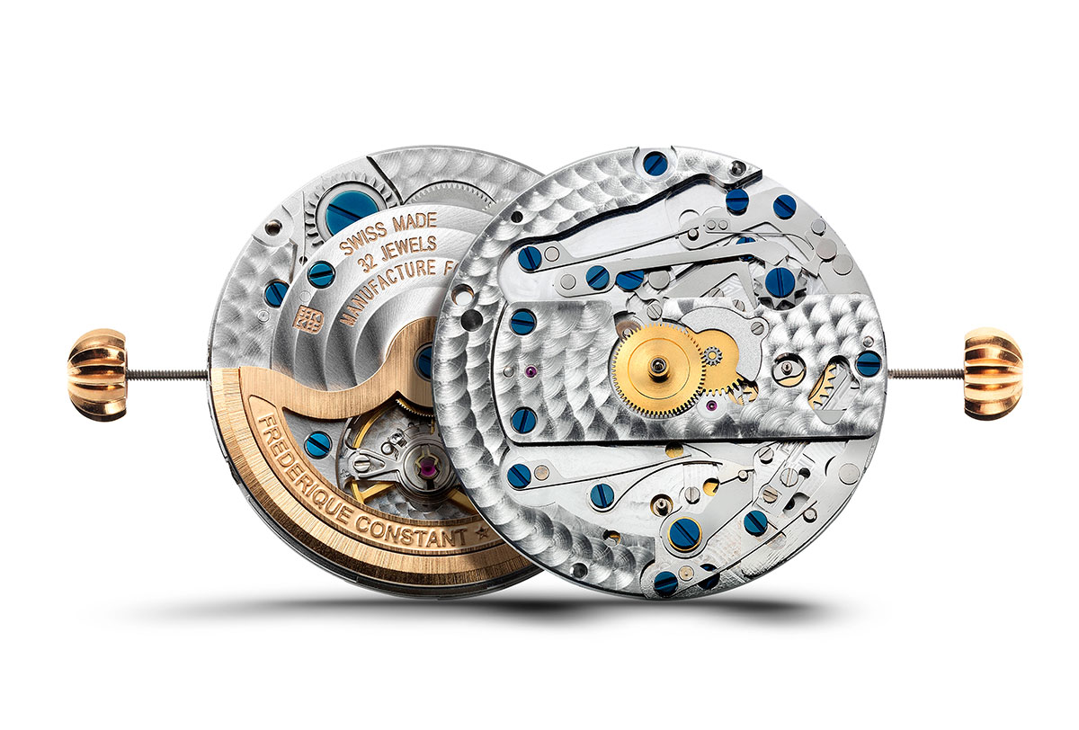 Он задуман инженерами Frederique Constant на модульной конструкции. Состоит из 233 деталей (из них лишь 96 элементов относятся к модулю хронографа Flyback, что говорит об оригинальности конструкции хронографа), ротора автоматического подзавода двустороннего действия, имеет 38-часовой запас хода. Скептики могут предположить, что столь малое количество элементов может отразиться на качестве часов. Но это совершенно не так. Обладатель такого уникального аксессуара по достоинству оценит продуманность до мелочей всех функциональных связей. Для этого достаточно в первый раз нажать на кнопку хронографа, расположенную над заводной головкой. Часы защищены от ошибок в управлении. Это сразу ощущается при запуске по сопротивлению нажатию кнопки. Если же препятствий запуску хронографа нет, то нажатие проходит гладко. То же самое относится и к последующим фазам остановки и перезапуска.