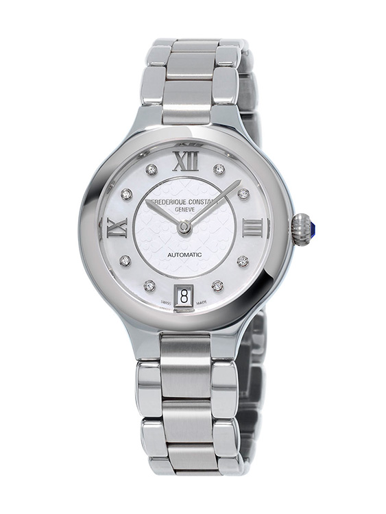 На циферблате, с отделкой серебристым перламутром по цифровому полю и белым либо серебристым узором гильоше по центру, установлены центральные стрелки часов и минут в стальном полированном, розово-золотом или воронёном исполнении. Индикация представлена: римскими цифрами (III, IX, XII) из полированной нержавеющей стали и восемью бриллиантами, стальными римскими цифрами (III, IX, XII) с розово-золотым гальваническим покрытием и таким же количеством бриллиантов, либо чёрными печатными римскими цифрами, а также окошком даты на отметке «6 часов». Дополнительным декором циферблата являются изящные надписи: «Frederique Constant – Geneve – Automatic – Swiss Made».