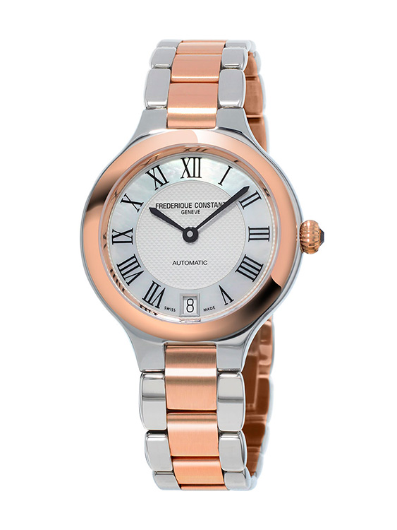 2. Frederique Constant Classics Delight Automatic FC-306WHD3ER2B Корпус из полированной нержавеющей стали с розово-золотым гальваническим покрытием безеля. Циферблат с отделкой серебристым перламутром по цифровому полю и белым узором гильоше по центру. Центральные стрелки и римские цифры с розово-золотым гальваническим покрытием, восемь бриллиантов в виде условных индексов, прямоугольное окошко даты. 3-рядный браслет из нержавеющей стали с розово-золотым гальваническим покрытием центральных звеньев. Раскладывающаяся стальная застёжка с розово-золотым гальваническим напылением. |