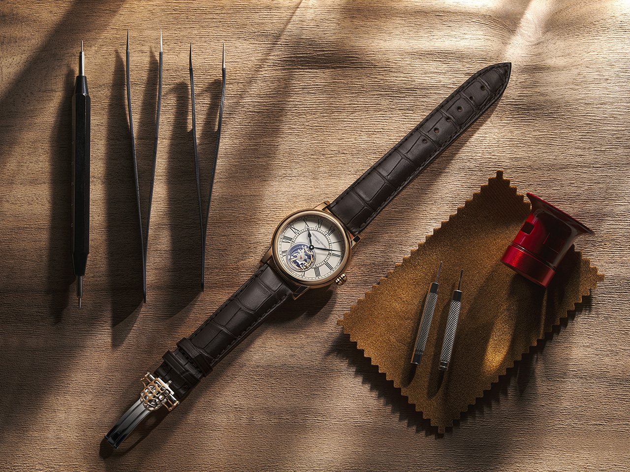 Эти более тонкие и изящные часовые метки изысканно выделяются на белом лакированном циферблате и сопровождаются минутной шкалой «железная дорога», что приближает новую модель к стандартам, существовавшим чуть более века назад. Чтобы не нарушать дух, присущий коллекции с момента ее создания, Мануфактура использовала черные стрелки, разработанные в 2004 году, с очень тонкой минутной стрелкой в форме листа и сердцеобразной часовой стрелкой.