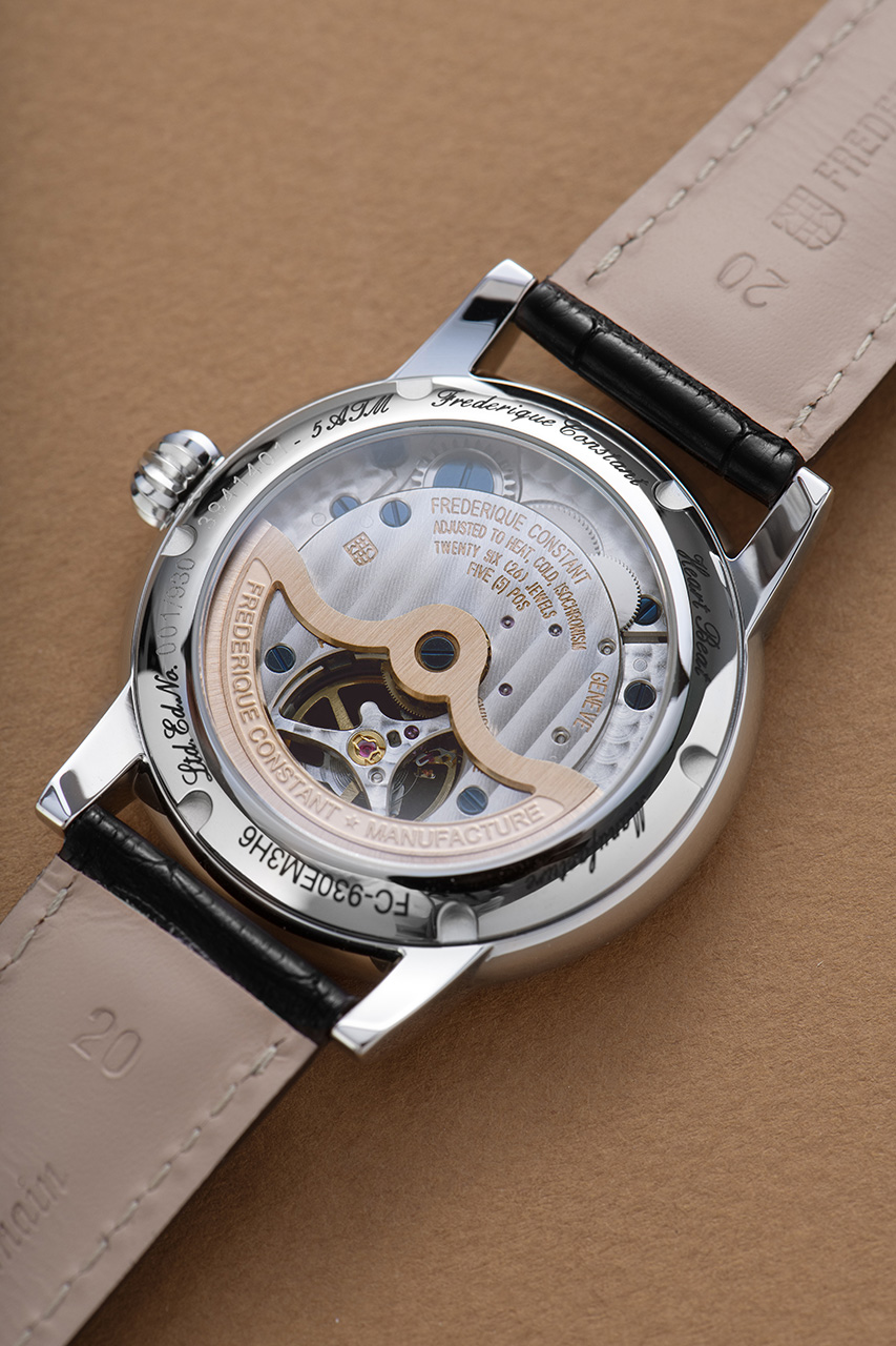 Знаменитая лукообразная заводная головка, также характерная для классического дизайна, была сохранена, как и мануфактурный механизм, который она приводит в движение. Часы Classics Heart Beat Manufacture оснащены калибром FC-930-3 с частотой 28 800 колебаний в час и 38-часовым запасом хода, который был разработан и собран в женевской мастерской Frederique Constant. Декорированный мелким круговым зернением и узором Côtes de Genève, он виден через прозрачную заднюю крышку часов.