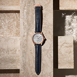 Часовая и минутная стрелки того же стиля, выполненные в виде мечей, покрыты люминесцентным веществом, необходимым для навигации после захода солнца, в ритме теплого летнего вечера. Для разных вариантов корпуса – из розового золота или из стали предусмотрено соответствующее сочетание стрелок. Стальная версия включает бирюзово-голубую секундную стрелку, которая воплощает морской дух коллекции Runabout, и декоративную строчку в тон на сине-сером кожаном ремешке. Вариант часов с покрытием из розового золота дополнен темно-синим кожаным ремешком с прострочкой серовато-белого оттенка.