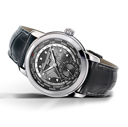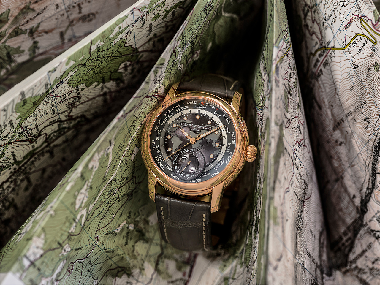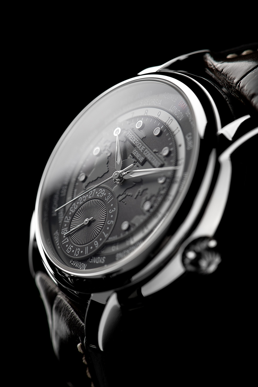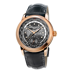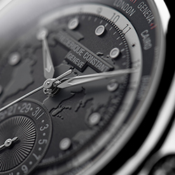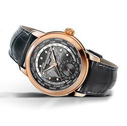 На часах выделяются два отдельных диска: первый – с 24-часовым индикатором день-ночь, второй – с названиями 24 городов. Поскольку калибр FC-718 является механизмом собственной разработки бренда, он украшен отделкой перлаж (зернение) и круговым узором Côtes de Genève. Имеет запас хода 42 часа. Темно-серый хронометр комплектуется темно-серым ремешком из крокодиловой кожи с белыми стежками.
