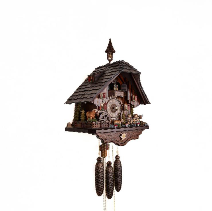 Механизм механический, с цепной тягой и тремя гирями, каждая из которых отвечает за отдельную функцию: движение стрелок, работу кукушки и музыкальный блок. Запас хода — 8 дней. Есть ручное отключение звука.