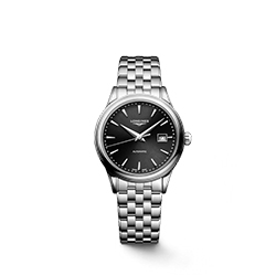 Чёрный циферблат с узором sunray подчёркивает глубину цвета и изящество накладных меток, а посеребрённые стрелки обеспечивают отличную читаемость. Корпус диаметром 30 мм гармонично смотрится на запястье, сохраняя классические пропорции.