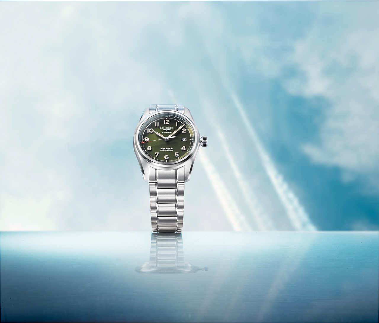 Новинка с зеленым циферблатом, оснащенная тремя стрелками и календарем, доступна в двух размерах – 40 и 42 мм. Новый цвет гармонично сочетается с бежевым покрытием Super Luminova в винтажном стиле, а пескоструйная обработка циферблата создает стильный металлизированный эффект. Как символ неизменно высокого качества механизмов Longines на циферблате модели изображены пять звезд.