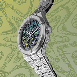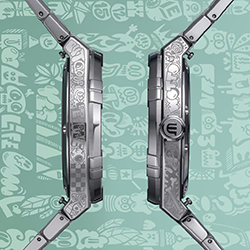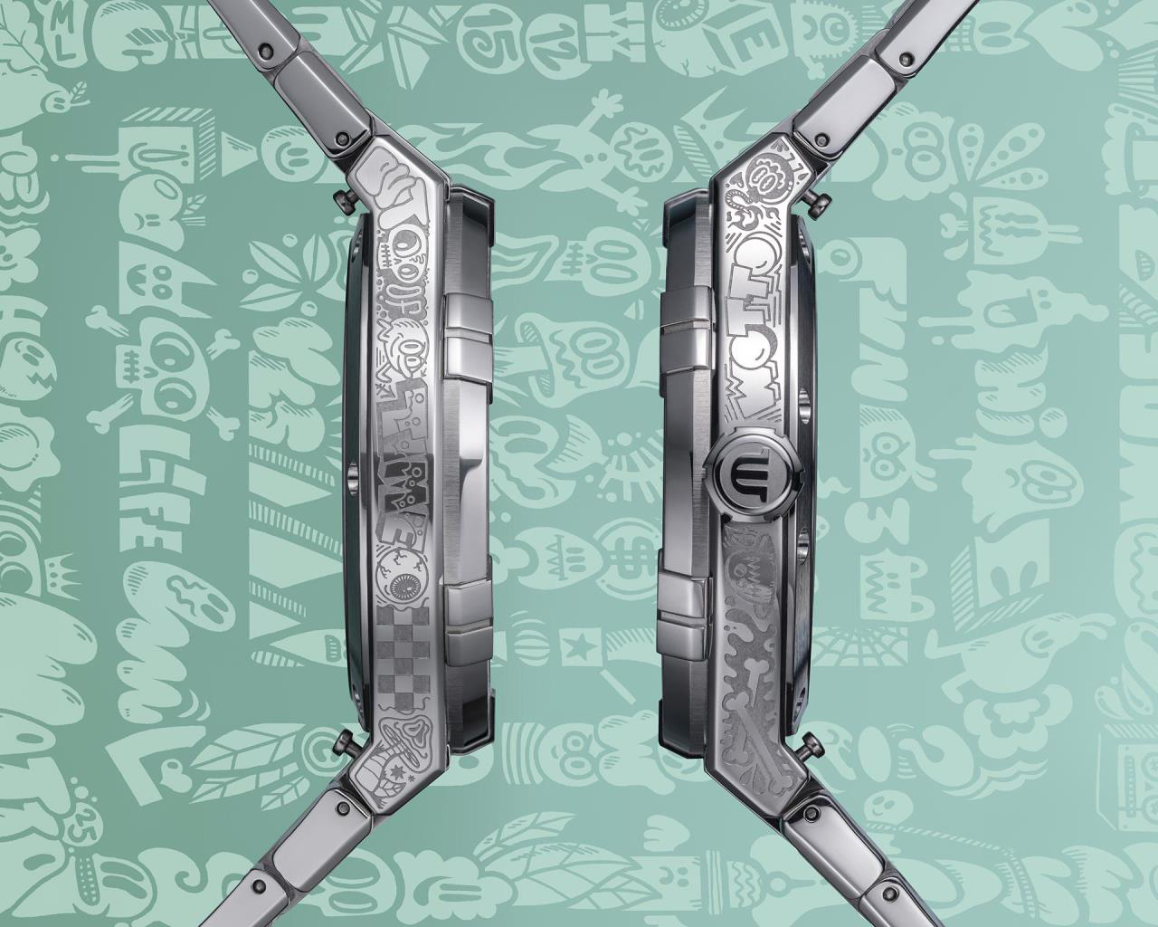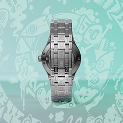 История модели уходит корнями в 2021 год, когда венгерский гравёр @Timeengraver представил кастомные AIKON на базе Instagram. Эта волна креативности вдохновила Maurice Lacroix на создание официальных лимитированных серий с глубоким гравированием. В новой AIKON Automatic Wotto фантазия Уотто получила полную свободу — корпус, браслет и безель покрыты множеством мелких художественных элементов, таких как грибы, призраки-скейтбордисты, молнии и его фирменная «W». Всё это собрано в единый орнамент, превращающий каждый элемент часов в миниатюрное произведение искусства.