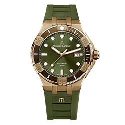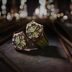 Впервые часы AIKON Venturer выпускаются в бронзе. Корпус диаметром 43 мм выполнен из особого сплава, который с течением времени способен покрываться патиной или темнеть, не разрушаясь при этом. Бронза известна человечеству многие века как самый долговечный материал для изготовления инструментов. Команда разработчиков Maurice Lacroix выбрала этот металл, чтобы подчеркнуть строгую функциональность моделей Venturer, и дополнила новинку подходящим циферблатом насыщенного зеленого цвета с отделкой «солнечные лучи». Гармонию натуральных теплых оттенков продолжает зеленый каучуковый ремешок с геометрическим узором. Благодаря системе Easychange каучуковый ремешок можно легко заменить на винтажный коричневый ремешок из телячьей кожи с бежевой прошивкой. Безель выполнен из коричневой керамики. Выступы на безеле, выполняющие роль часовых меток, выдержаны в стилистике AIKON Venturer. Как и корпус, они изготовлены из бронзы. Данная модель, оснащенная автоматическим механизмом ML 115, выпущена ограниченной серией из 500 экземпляров.