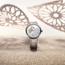 Эти часы сочетают в себе изысканную эстетику и высокое часовое мастерство. Модель создана в двух версиях: первая – с синим авантюриновым циферблатом, мерцающих как ночное звездное небо. Вторая версия – с молочно-белым перламутровым циферблатом, украшенным сияющими линиями, которые исходят от двух сердец в виде лучей солнца.