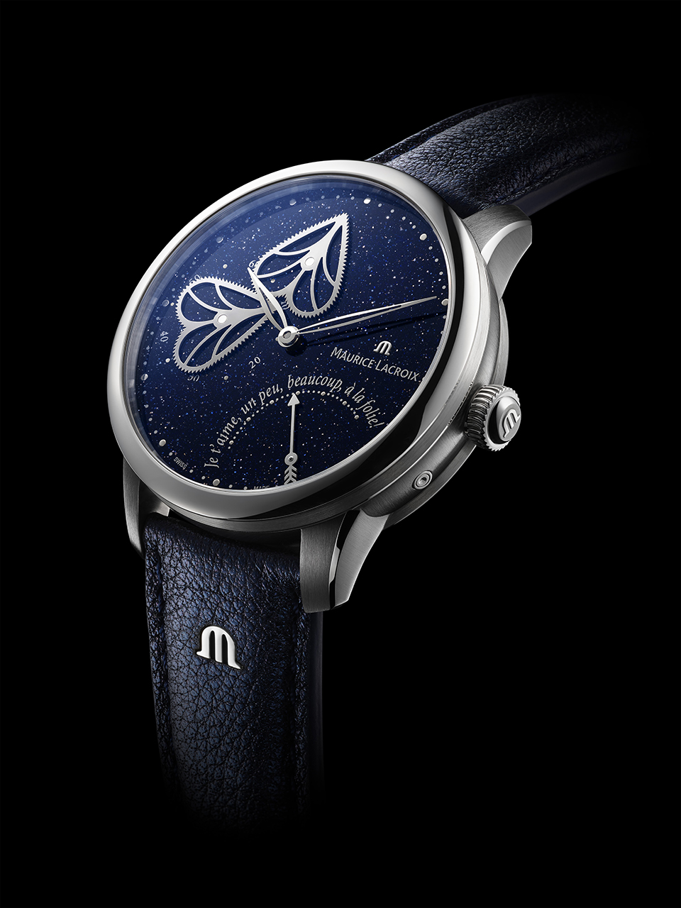 Стильные скелетонированные часовая и минутные стрелки в форме тонких листьев идеальны для индикации основной функции – времени. В нижней части циферблата расположена еще одна необычная стрелка, напоминающая стрелу, пущенную из лука Купидона. Она служит индикатором запаса хода. Когда человек влюблен, его сердце бьется неровно, и эмоции затмевают рассудок. Об этих чувствах владелице часов напоминает фраза, расположенная на циферблате и в переводе с французского означает «я люблю тебя немного, сильно, безумно!»
