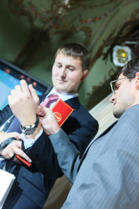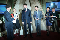 Генеральный директор представительства швейцарской часовой компании ORIS в России Павел Ларин презентовал Евгению часы из серии ORIS Divers, а другой партнер номинации компания Volvo Car's Russia - вручила победителю право пользования автомобилем Volvo на срок 1 год.