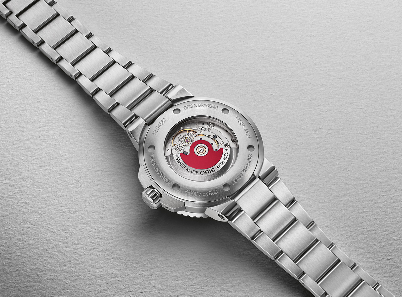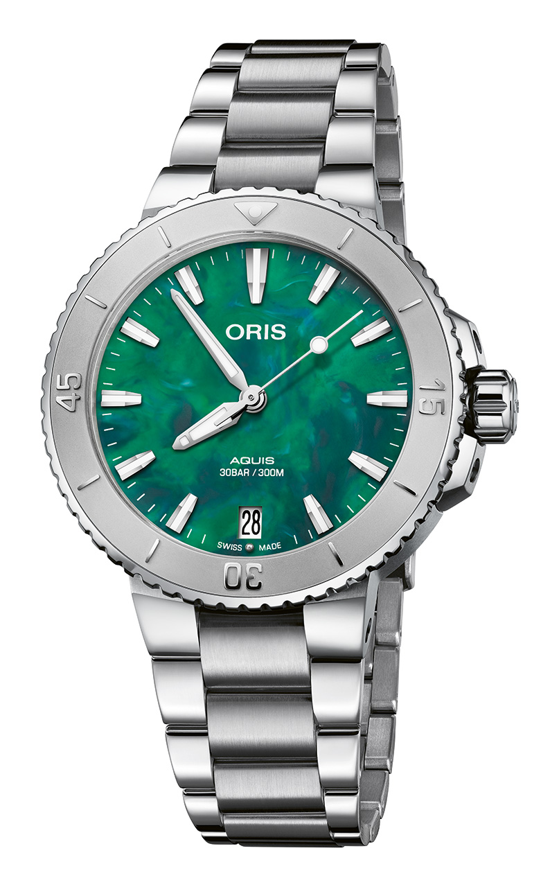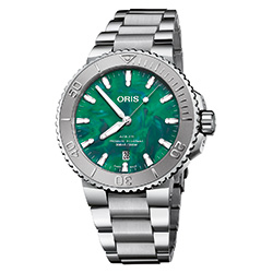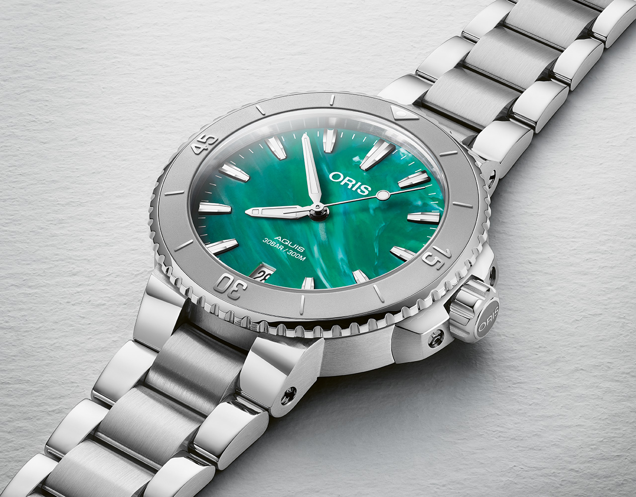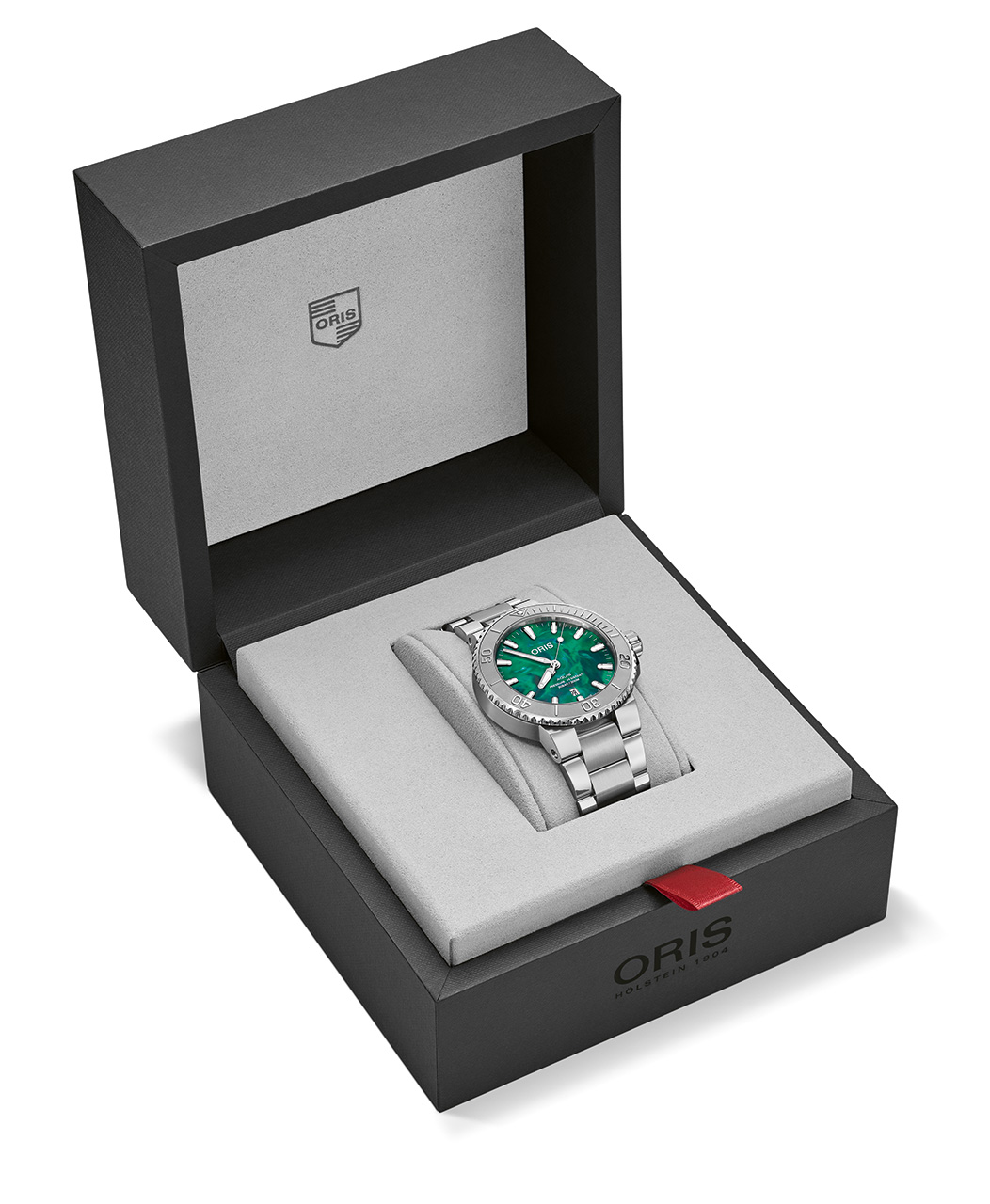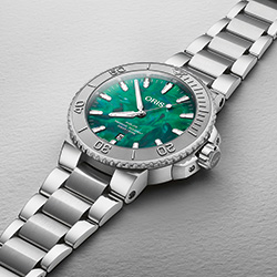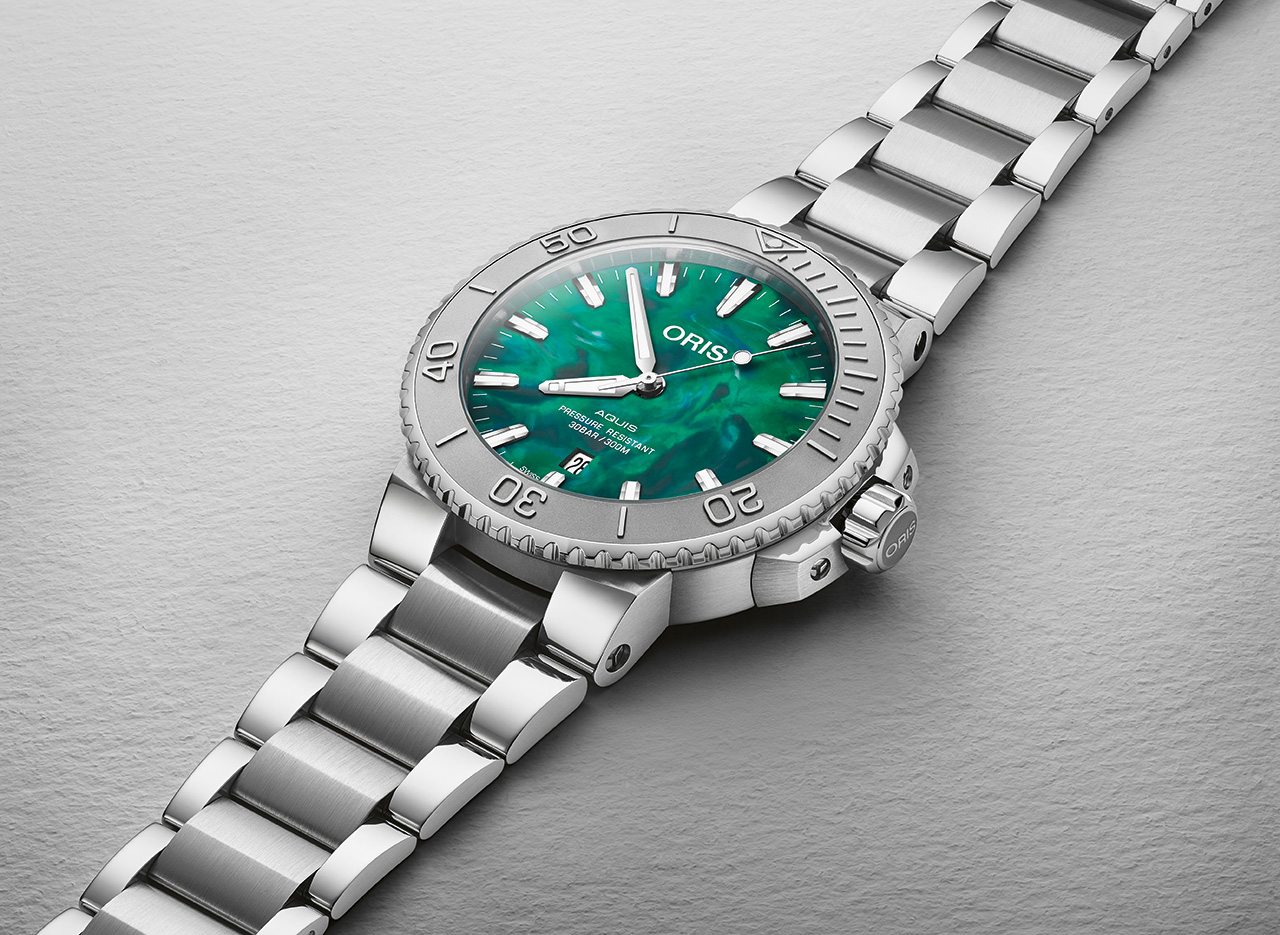 Специальная версия часов Aquis Date, Oris X Bracenet, оснащена уникальным циферблатом, изготовленным из переработанных сетей. Материал циферблата обработан без добавок клея, делая каждый экземпляр уникальным. Эти часы не только представляют высокую технологичность, но и служат символом борьбы с загрязнением океанов.