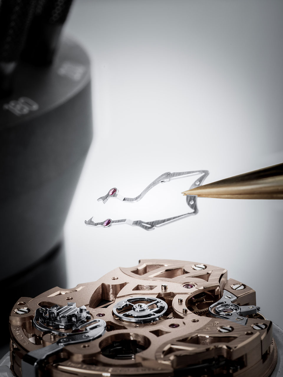 Декорирование золота не менее сложно технически и требует более 50 рабочих часов на одну единицу. Каждый часовой механизм имеет концентрический вырез на мостах вокруг баланса. Выделенный таким образом баланс становится центром механического спектакля. Мосты ажурированы специально для того, чтобы были виден механизм, «пульсирующий» на их фоне, и два колонных колеса, расположенных симметрично по отношению к оси заводной головки. Свой вклад в общую картину вносят зерненые и сатинированные элементы, а также внутренние углы на мостах, на которых играют лучи света, подчеркнутые отблесками золота.