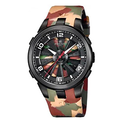 Циферблат украшен военным камуфляжем в светло-зеленых, оливково-зеленых, бежевых и коричневых тонах.