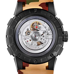 Часы оснащены автоматическим мануфактурным калибром Perrelet P-331 с 42-часовым запасом хода. Задняя крышка закрыта прозрачным иллюминатором, через который можно видеть изысканную отделку мостов и ажурный ротор. К часам прилагается каучуковый ремешок с камуфляжным узором и стальная застежка с черным PVD-покрытием, украшенная логотипом марки.