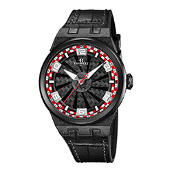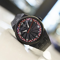 Динамичную цветовую гамму темному циферблату придает красно-белый узор в виде шахматной доски, нанесенный на минутный фланец и часовое кольцо. Смешанные индексы нанесены на циферблат и залиты Super-LumiNova. В соответствии с красной, белой и черной палитрой, вдохновленной гоночными трассами, часовая и минутная стрелки излучают белое свечение в темноте, в то время как центральная секундная стрелка с ажурным противовесом выделена ярко-красным цветом.