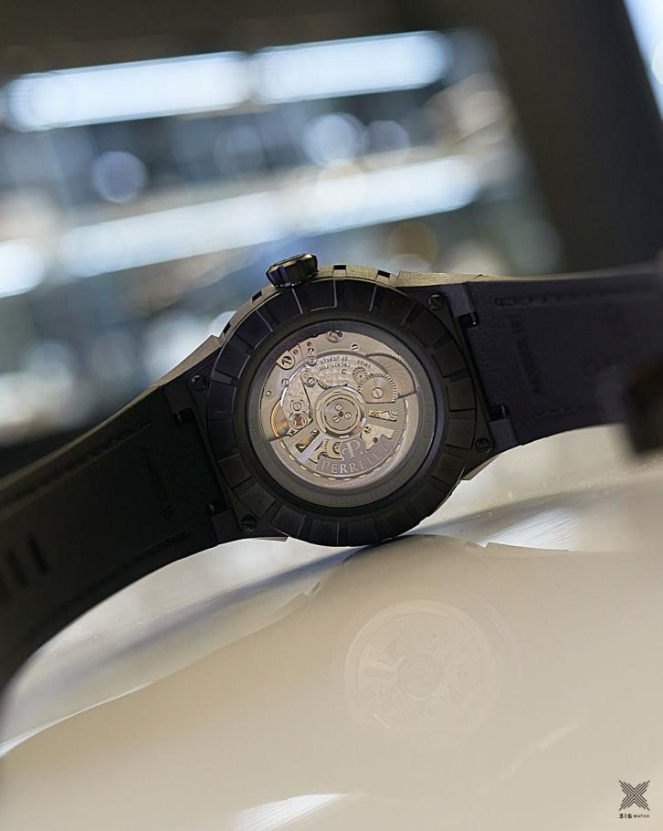 Сердцем этого собрания инновационных технологий и современного дизайна является модель Perrelet второго поколения P-331-MH. Этот автоматический калибр собственного производства изготовлен компанией Soprod, престижным швейцарским производителем часовых механизмов, принадлежащим Мигелю Родригесу, который производит все эксклюзивные калибры Perrelet. Кроме того, механизм имеет сертификаты COSC и Chronofiable chronometry, гарантирующие максимальную надежность и точность механизма, приводящего в действие эти часы. Как и во всех часах Perrelet, отделка механизма тщательно выполнена с использованием перламутра на основной пластине и ажурной колеблющейся гири с родиевым покрытием и логотипом Perrelet.