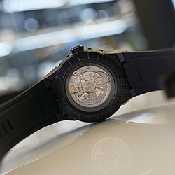 - Задняя крышка из нержавеющей стали с черным PVD покрытием и сапфировым стеклом.