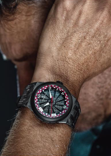 Переводя скорость гоночной трассы в формат наручных часов, циферблат Turbine Carbon Racing оснащен фирменной 12-лопастной турбиной, которая реагирует на малейшее движение запястья, вращаясь вокруг циферблата, открывая матово-черный дополнительный циферблат. Изготовленные из черного анодированного алюминия с пятью противовесами, которые позволяют ему замедляться и возвращаться в исходное положение, лезвия декорированы текстурой из углеродного волокна в тон материалу корпуса.