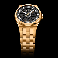 Знаменитый циферблат с 12-лопастной турбиной – отличительный дизайнерский код всех моделей коллекции Perrelet Turbine – защищен сапфировым стеклом. Оригинальный объемный эффект, создаваемый лопастями турбины, создает впечатление погружения внутрь циферблата. Турбина, изготовленная из черного анодированного алюминия, поворачивается, повинуясь, каждый раз движениям запястья обладателя часов. При вращении лопастей словно проявляется нижняя поверхность циферблата с ее яркими оттенками красного, «электрического» синего или золотистого цвета – в зависимости от варианта исполнения.