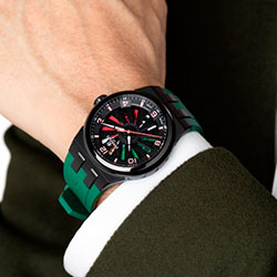 • Ремешок: Зеленый каучуковый с застежкой из титана класса 2 с черным DLC покрытием.