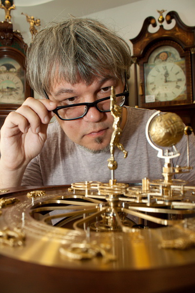 Это, пожалуй, одна из самых ярких коллекций немецкой компании. Миниатюрная модель солнечной системы с фигурой могущественного бога Солнца в центре и земным шаром в сопровождении своей спутницы - Луны - напротив. На специальном диске, окружающем планетную группу, отображается дата, месяц и знак Зодиака. Невольно вспоминается Кант, сказавший, что для него есть только две вещи, которые достойны внимания - звёздное небо над головой и "нравственный закон внутри нас". С внутренним миром ничего не поделать (работать над собой нужно!), а вот по-новому увидеть себя в мире удастся благодаря Hermle "Tellurium III". Александр Воронов промолчал, какие скрытые смыслы ему открылись. Не понятно, сколько бы еще он стоял вот такой, завороженный, строя из себя щепетильного часового мастера, если бы быстрый фотограф не сказал... "Снято!".
