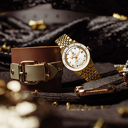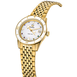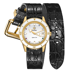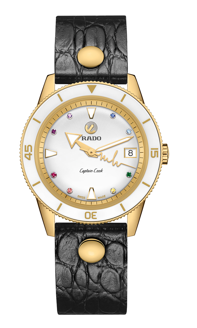 Новый Rado Captain Cook «сердцебиение Марины Хоерманседер» – это приглашение отпраздновать все то, что любят в берлинском районе Кройцберг, и уникальность во всем. Новые часы украшены красочной радугой из восьми драгоценных камней и нанесенными на яркий и выразительный циферблат индексами, поверхность которого перекликается с белой высокотехнологичной керамической вставкой во вращающемся безеле. Золотистые металлизированные метки и цифры и с лазерной гравировкой идеально сочетаются с полированным PVD-покрытием желто-золотого цвета корпуса и безеля из нержавеющей стали. Циферблат и символ золотого движущегося якоря с серебристой задней панелью, темно-серые логотипы Rado и Captain Cook защищены изысканным сапфировым стеклом в форме коробки, хорошо известным любителям продукции Captain Cook. Кристалл имеет прозрачное покрытие на обеих гранях, а на часовую и минутную стрелки нанесено белое покрытие Super-LumiNova® для максимальной читаемости.
