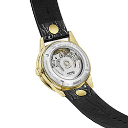 Внутри размещен автоматический механизм Rado R763 с 25 камнями, тремя стрелками и окошком даты в положении «3 часа». Антимагнитная пружина NivachronTM обеспечивает модели 80-часовой запас хода с регулировкой в пяти положениях. Дополнительное сапфировое стекло на завинчивающейся задней крышке корпуса позволяет любознательным ценителям часов любоваться работой этой оригинальной модели Captain Cook от Marina Hoermanseder X, водонепроницаемость которой составляет до 10 бар (100 м). Часы поставляются с тремя различными вариантами браслета или ремешка. Первый браслет из нержавеющей стали с PVD-покрытием цвета желтого золота, полированный или матовый, типа рисовых зерен, с тройной застежкой из полированной нержавеющей стали. Дополнительный черный ремешок из кожи НАТО двойной длины (с тиснением под кожу аллигатора) с фирменной пряжкой Marina из нержавеющей стали с PVD-покрытием желто-золотого цвета. В комплект входит еще один черный кожаный ремешок стандартной длины с таким же рельефным рисунком аллигатора и пряжкой из нержавеющей стали с PVD-покрытием желто-золотого цвета. Часы поставляются в красивом черном чехле под брендом Marina Hoermanseder.