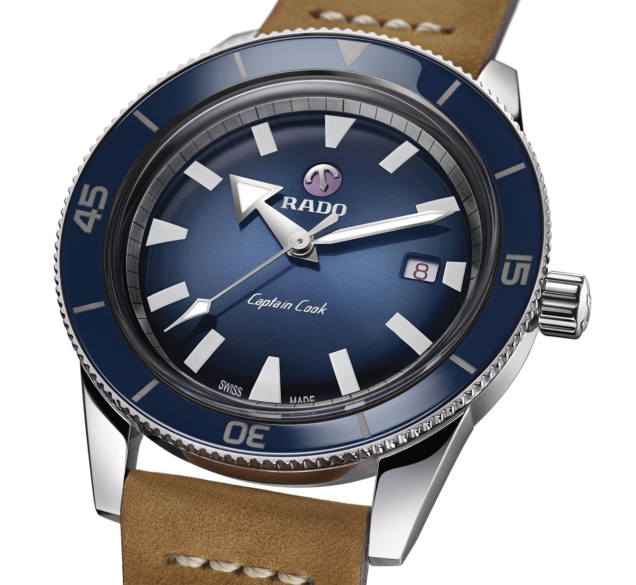 Компания Rado всегда придавала огромное значение форме, и именно она является отличительной деталью новых часов из коллекции Captain Cook. Стрелки в форме меча и стрелы, изогнутый циферблат невероятно эффектны и аутентичны, а деления клиновидной формы с люминесцентным покрытием притягивают взгляд.