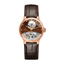 Корпус из нержавеющей полированной стали с PVD-покрытием розовым золотом. Скелетонированный циферблат шоколадно-коричневого цвета с центральными розово-золотыми стрелками и условными часовыми бриллиантовыми индексами: