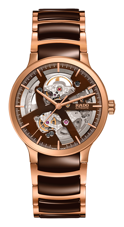 Корпус из нержавеющей полированной стали с PVD-покрытием розовым золотом. Скелетонированный циферблат шоколадно-коричневого цвета с центральными розово-золотыми стрелками и условными накладными розово-золотыми часовыми индексами. Задняя крышка корпуса из прозрачного сапфира. Браслет с раскладывающейся застёжкой из нержавеющей полированной стали с розово-золотым PVD-покрытием и шоколадно-коричневыми полированными промежуточными звеньями из высокотехнологичной керамики.