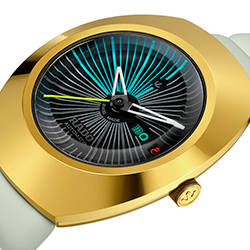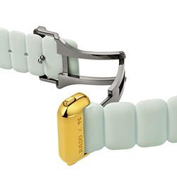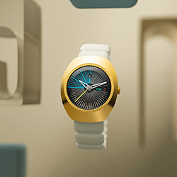 Корпус выполнен из фирменного материала Ceramos, а безель с PVD-покрытием жёлтого золота подчёркивает скульптурные линии. Матовый чёрный циферблат дополнен серебристо-синей минутной шкалой и оригинальным шрифтом Tej Chauhan для индикации дня недели и даты. Светло-серый каучуковый ремешок в форме «подушки» усиливает контраст и делает образ по-настоящему дизайнерским.