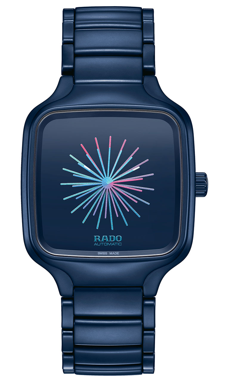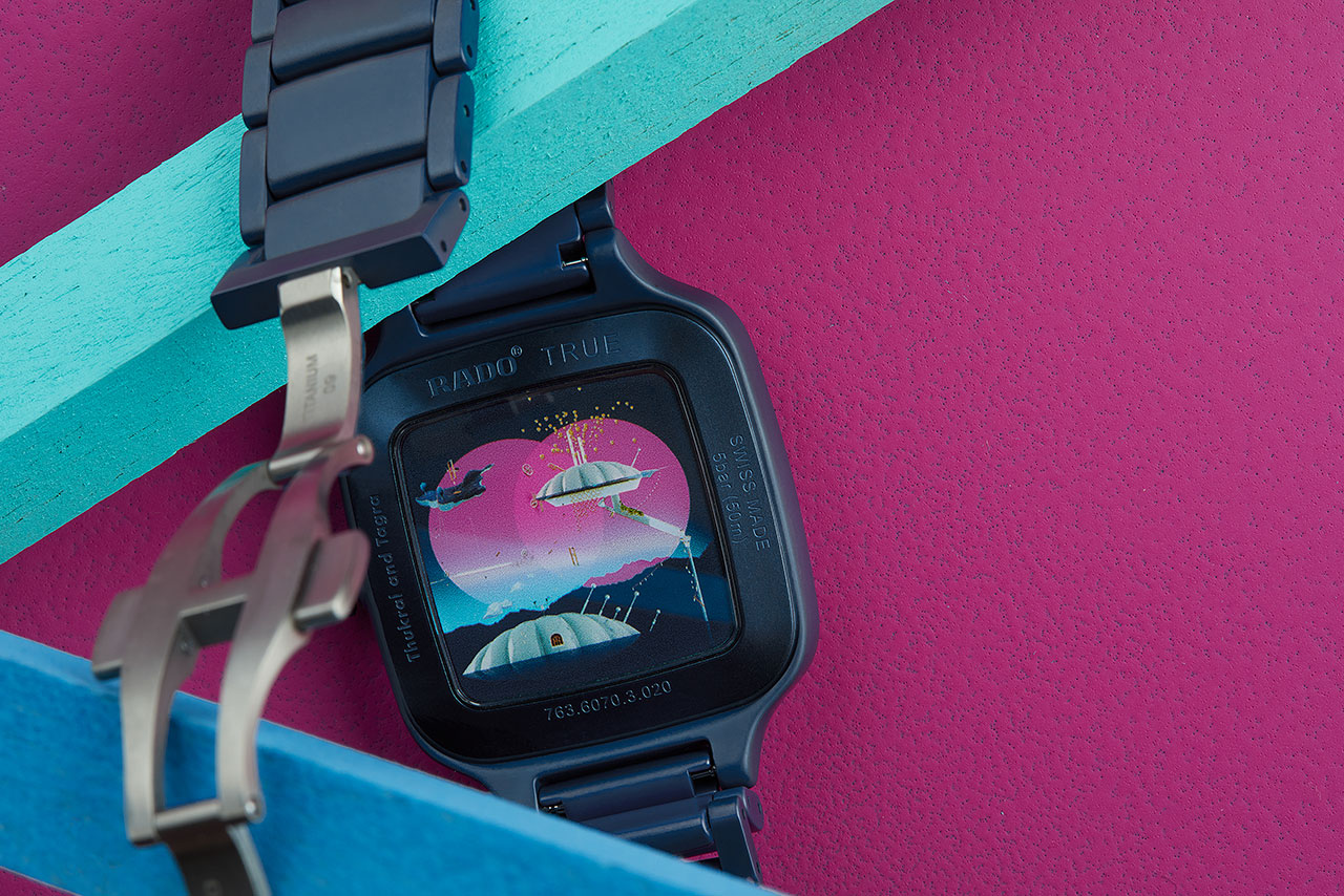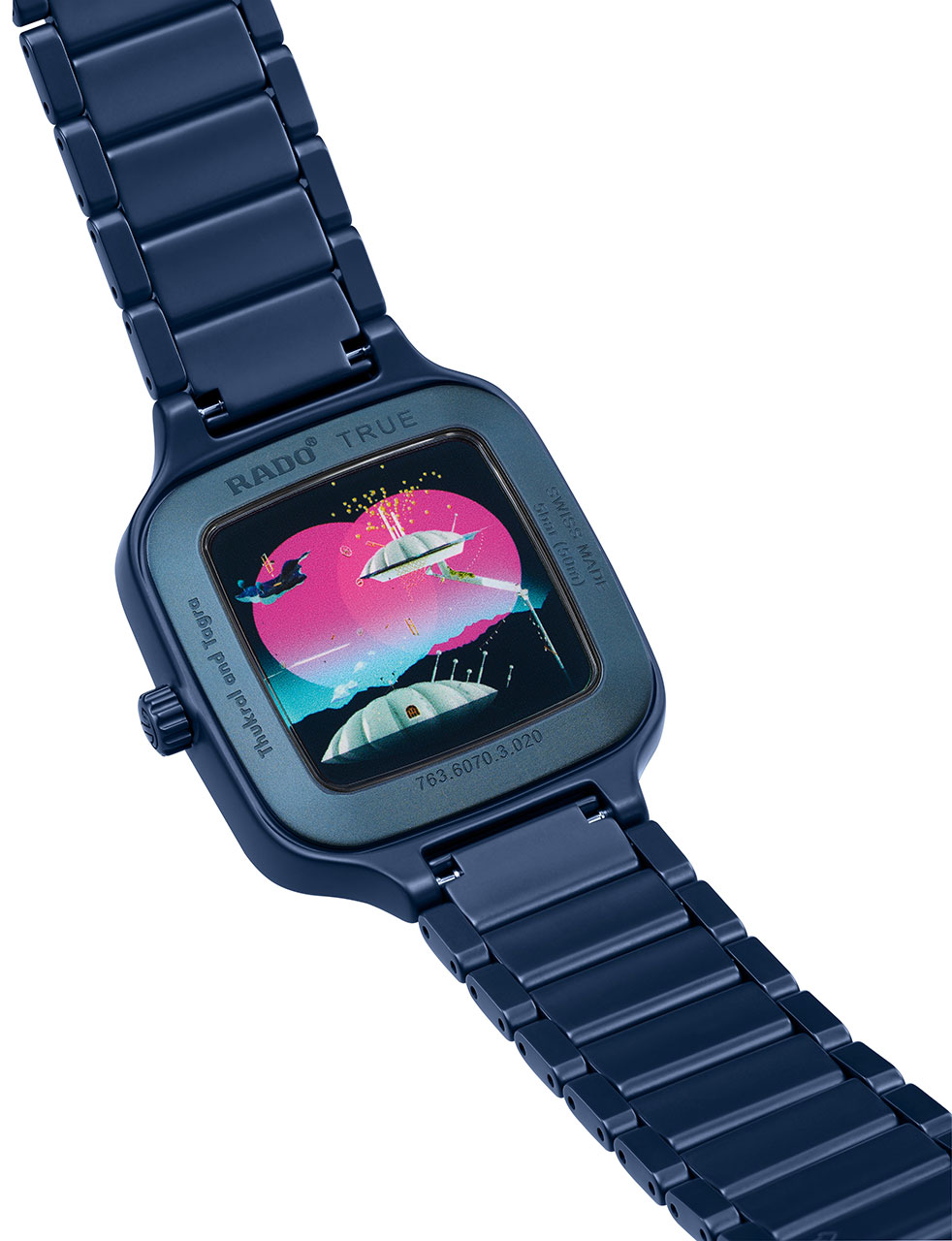 Циферблат с цветными акцентами облачен в квадратный корпус из матовой высокотехнологичной керамики синего цвета диаметром 38 мм — культовые дизайн и форма Rado родом из 70-х, обновленные в духе ХХІ века. Задняя крышка корпуса украшена рисунком под названием Dominus Aeries, созданным дуэтом, который сочетает в себе взгляд на будущее и воспоминания из прошлого. Поэтому верхняя и задняя часть часов являются прекрасными произведениями искусства в исполнении Thukral and Tagra.
