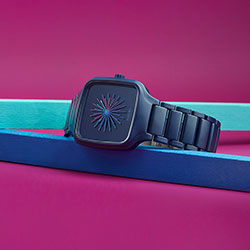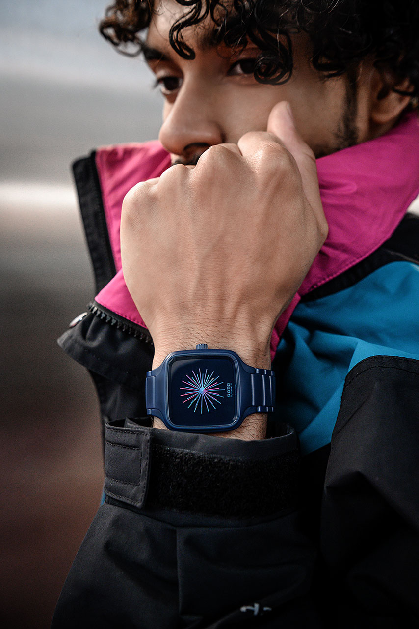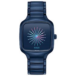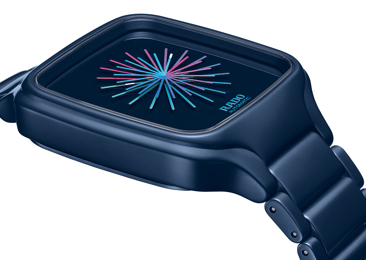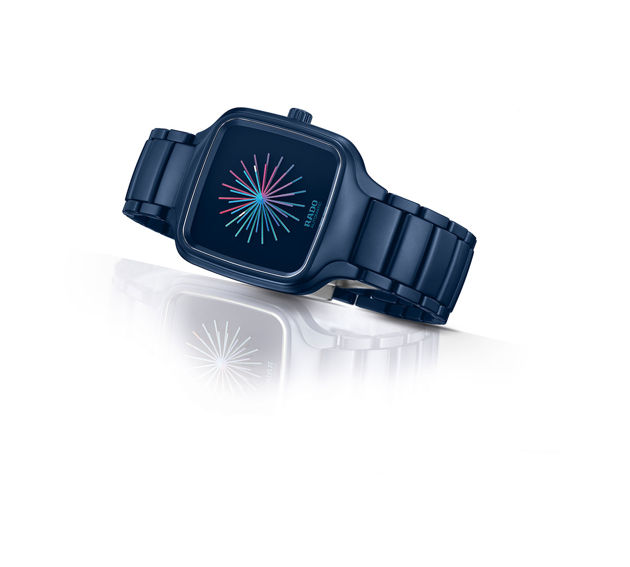 Циферблат с цветными акцентами облачен в квадратный корпус из матовой высокотехнологичной керамики синего цвета диаметром 38 мм — культовые дизайн и форма Rado родом из 70-х, обновленные в духе ХХІ века. Задняя крышка корпуса украшена рисунком под названием Dominus Aeries, созданным дуэтом, который сочетает в себе взгляд на будущее и воспоминания из прошлого. Поэтому верхняя и задняя часть часов являются прекрасными произведениями искусства в исполнении Thukral and Tagra.