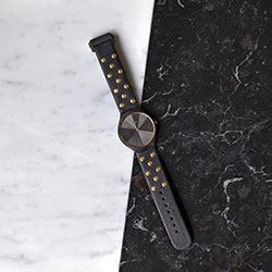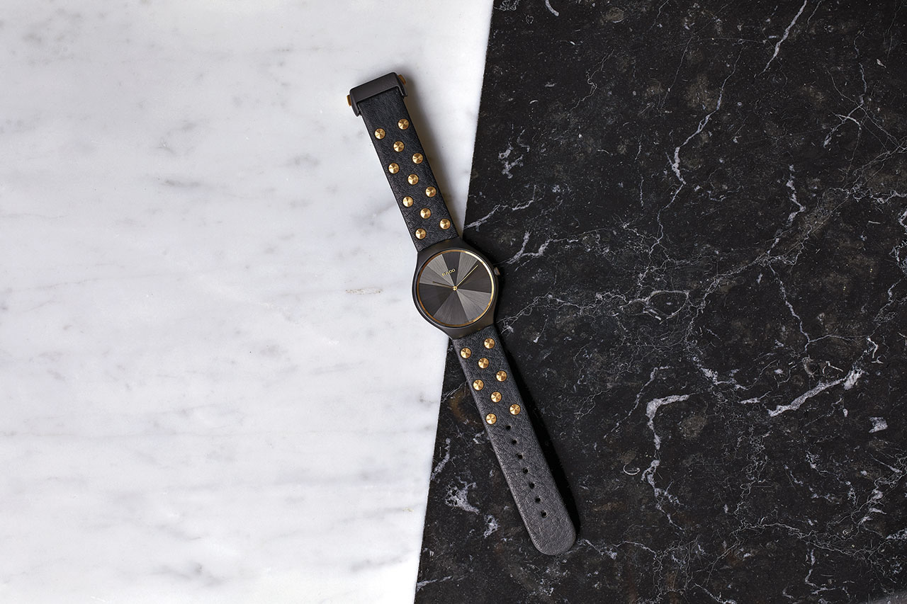 • Кожаный черного цвета с 19 скобами из нержавеющей стали c PVD покрытием цвета золота.