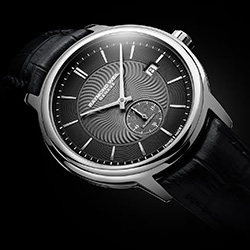 Именно тонкое использование линий, текстур и оттенков отличает циферблат модели Maestro 2238 от других в изысканном стиле. Серый циферблат имеет слегка дымчатый оттенок, переходящий от средне-серого в центре циферблата к темно-серому по периметру. В центральной части циферблата расположен завораживающий вихревой узор, а часовая дорожка украшена узором в виде улитки. Минутная дорожка, расположенная по периметру циферблата, обозначена четкими штрихами, что облегчает считывание показаний. И наконец по краю циферблата проходит тонкий ребристый узор, создающий видимость разграничения. Тонкие часовая и минутная стрелки серебристого цвета расположены в центре циферблата и дополнены соответствующими индексами. Рядом с заводной головкой расположилось окошко даты, а в положении «6 часов» индикатор малой секундной стрелки, декорированный «улиткой».