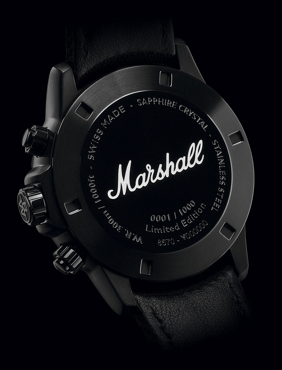 На задней панели модели Marshall Limited Edition, выпущенной ограниченным тиражом 1000 экземпляров, выгравирован легендарный логотип Marshall. Часы сопровождаются сертификатом соответствия. Специально для них разработана эксклюзивная упаковка, дизайн которой навеян отличительными чертами усилителей.
