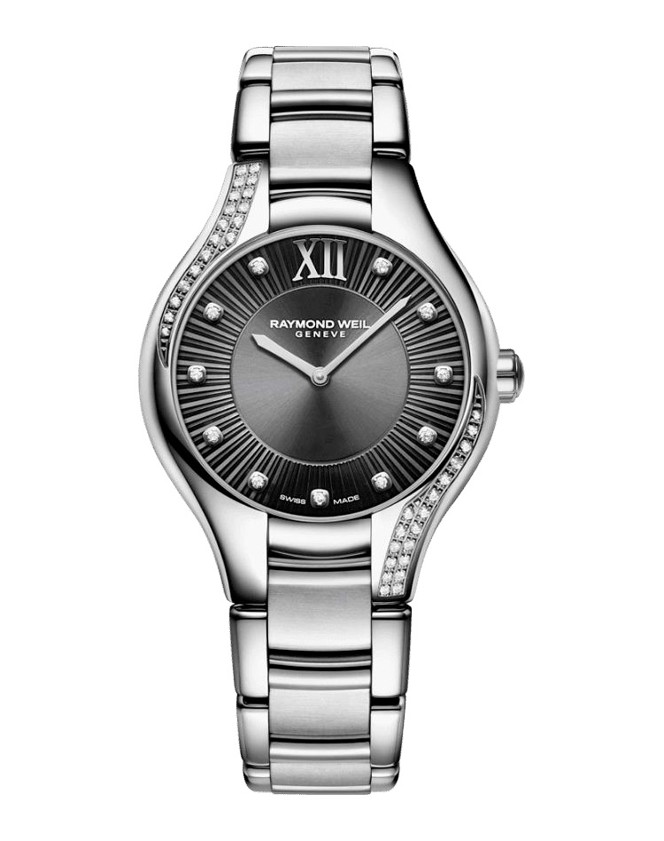 RAYMOND WEIL превратил одну из своих символических моделей в часы jewel – объект желания. Благодаря двум сверкающим каскадам из 18 бриллиантов, асимметрично расположенных на 32-миллиметровом корпусе, драгоценное украшение вышло из своего обычного контекста. Серый циферблат захватывает внимание своей глубиной. Гильошированная работа создает эффект света, текстуры, блеска и элегантности. Циферблат украшен 11 бриллиантовыми индексами и римским XII, что является ссылкой на предыдущие модели коллекции. Это гармоничное творение – ода изысканному стилю и женственной грации. С его слегка закругленными чувственными изгибами Noemia успокаивает, как утешительный талисман, мягко обволакивающий запястье. Ослепительный корпус, чистый циферблат и полированный и сатинированный стальной браслет являются отличительными чертами подлинного ювелирного изделия. Компаньон для всех моментов жизни.