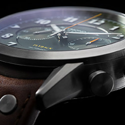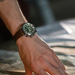 Часовая и минутная стрелки в минималистичном стиле в форме Baton расположены над циферблатом темно-зеленого цвета с накладными арабскими цифрами. Индексы в форме стрел в положениях «3» и «9 часов» отдают дань уважения пилотским часам прошлого, а часовая стрелка с богатой фактурой напоминает асфальт. Стрелки и часовые индексы оснащены люминесцентным покрытием Super-LumiNova®, которое улучшает считываемость показаний в условиях недостаточной освещенности. Центральная секундная стрелка хронографа выполнена в ярко-желтом цвете, который повторяется на 30-минутном регистре хронографа. Дизайн с двумя счетчиками обеспечивает симметричную и гармоничную компоновку, а циферблат окружен четкой белой дорожкой, облегчающей считывание показаний.