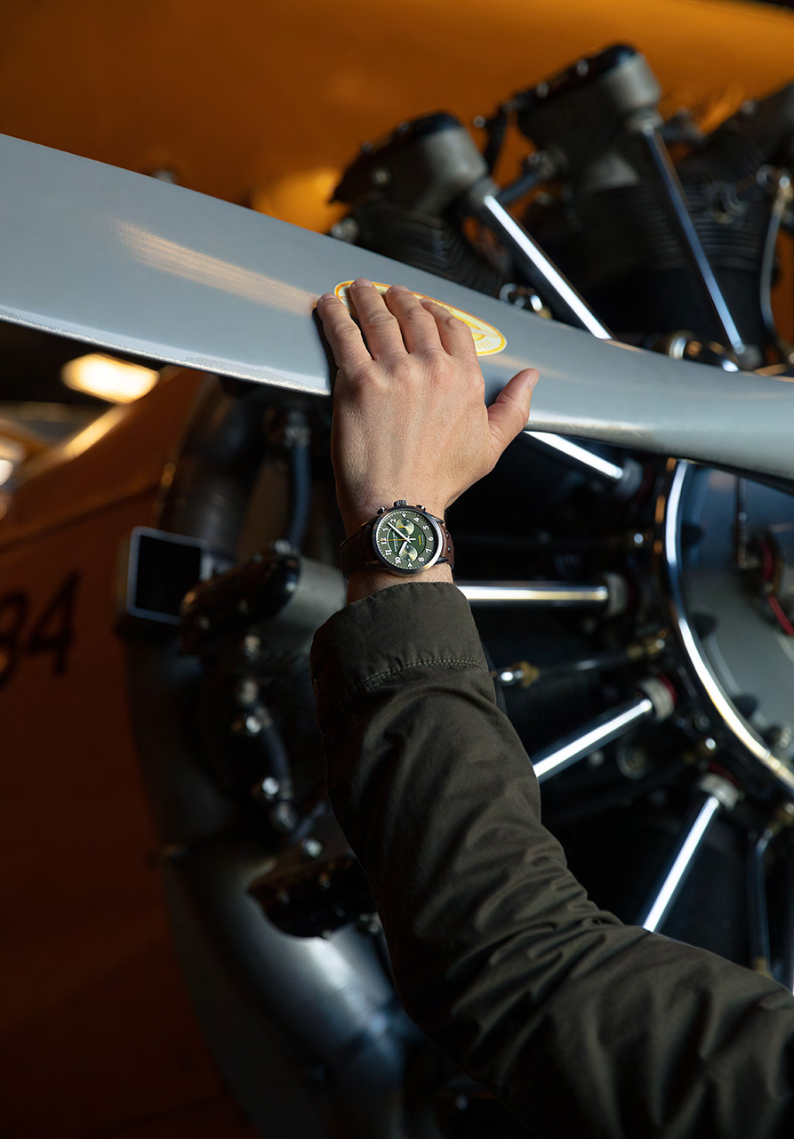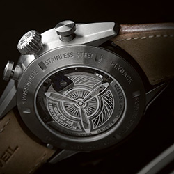 В корпусе диаметром 42 мм стальная поверхность покрыта серым PVD-покрытием, что придает часам элегантный и авантюрный вид. Эта винтажная авиационная тема распространяется и на заводную головку луковичной формы, которая является стандартом дизайна часов для пилотов, и на коричневый кожаный ремешок с заклепками, напоминающими заклепки на самолетах. Часы выпущены ограниченной серией в количестве всего 400 экземпляров. Их эксклюзивность подчеркивает характерный мотив пропеллера, выгравированный на задней крышке из сапфирового стекла.