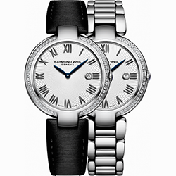 Циферблат часов «Raymond Weil Shine Ladies» с центральными листовидными стрелками часов и минут и окошечком даты на отметке «3 часа» имеет несколько вариантов исполнения: