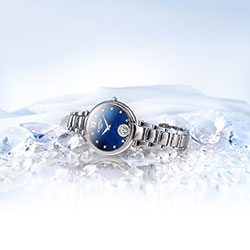 Циферблат из белого перламутра с драгоценным мерцанием окружности защищен антибликовым тонко отполированным сапфировым стеклом. В 6 часов вечера сверкающий ограненный кристалл, обрамленный венком из меньших по размеру циркониевых драгоценных камней, привлечет ваше внимание. Корпус из нержавеющей стали диаметром 38 мм и водонепроницаемостью на уровне до 5 банкоматов доступен в серебряном или двухцветном исполнении с безелем, стрелками и рифленой заводной головкой из розового золота.