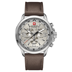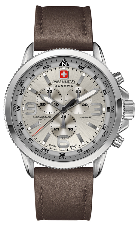 - Swiss Military Hanowa Arrow Chrono 06-4224.04.030: серебристый корпус, серебристый циферблат, тёмно-коричневый ремешок.