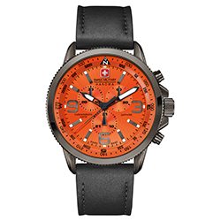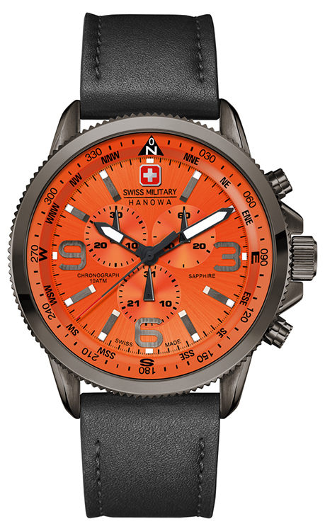 - Swiss Military Hanowa Arrow Chrono 06-4224.30.079: корпус с ионным напылением цвета оружейной стали, оранжевый циферблат и чёрный ремешок.