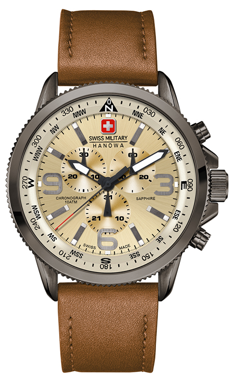 - Swiss Military Hanowa Arrow Chrono 06-4224.30.002: корпус с ионным напылением цвета оружейной стали, светло-коричневый циферблат и светло-коричневый ремешок.