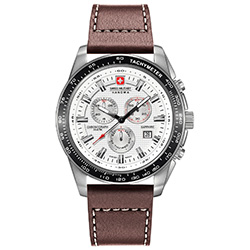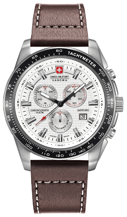 1. Swiss Military Hanowa Crusader Chrono 6-4225.04.001: корпус из нержавеющей стали 316L, безель с чёрным ионным покрытием и тахиметрической шкалой, белый циферблат с часовыми индексами стального цвета, коричневый кожаный ремешок с белой прострочкой.