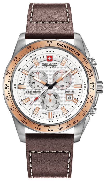 2. Swiss Military Hanowa Crusader Chrono 6-4225.04.001.09: корпус из нержавеющей стали 316L, безель с ионным покрытием розовой позолотой и тахиметрической шкалой, белый циферблат с часовыми индексами цвета розового золота, коричневый кожаный ремешок с белой прострочкой.