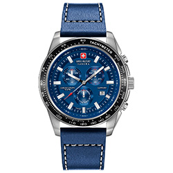 3. Swiss Military Hanowa Crusader Chrono 6-4225.04.003: корпус из нержавеющей стали 316L, безель с ионным покрытием чёрного цвета и тахиметрической шкалой, синий циферблат с часовыми индексами серого цвета, синий кожаный ремешок с белой прострочкой.
