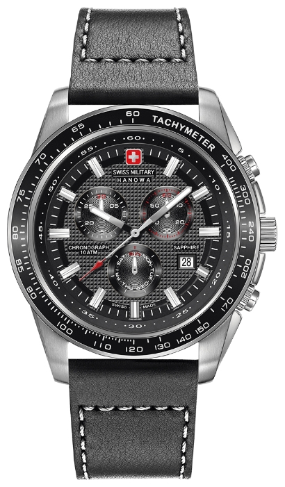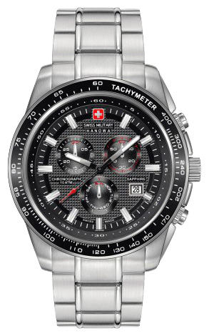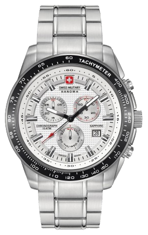 5. Swiss Military Hanowa Crusader Chrono 6-5225.04.001: корпус из нержавеющей стали 316L, безель с ионным покрытием чёрного цвета и тахиметрической шкалой, белый циферблат с часовыми индексами стального цвета, браслет из нержавеющей стали.