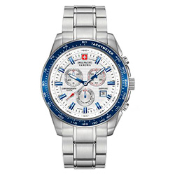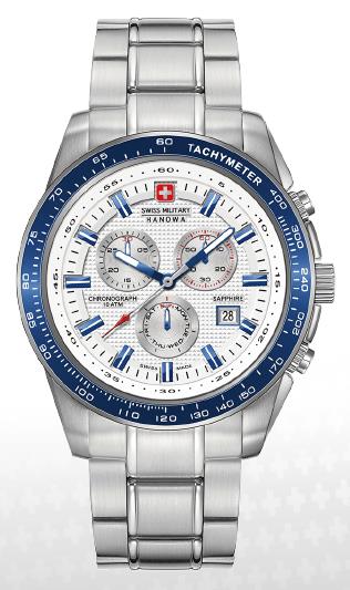 6. Swiss Military Hanowa Crusader Chrono 6-5225.04.001.03: корпус из нержавеющей стали 316L, безель с ионным покрытием синего цвета и тахиметрической шкалой, белый циферблат с часовыми индексами синего цвета, браслет из нержавеющей стали.